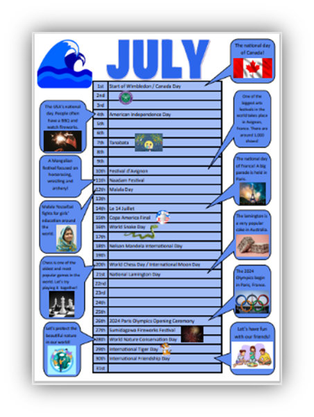 毎月、様々な国の祝日を載せたカレンダーを作成し、HRや授業で取り上げて各国の文化にふれます。