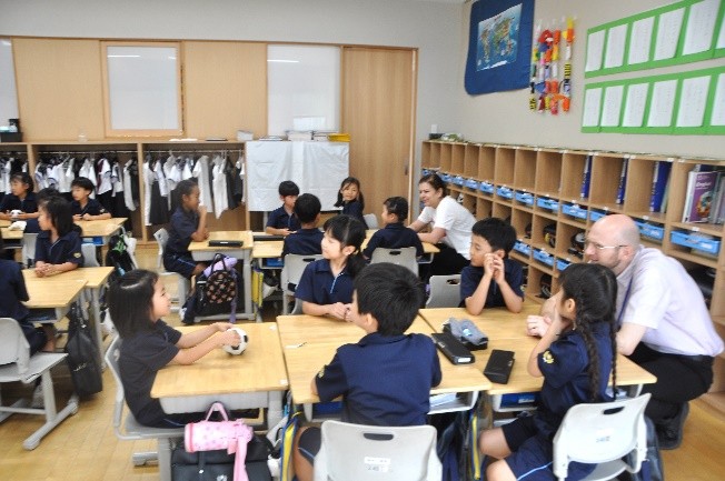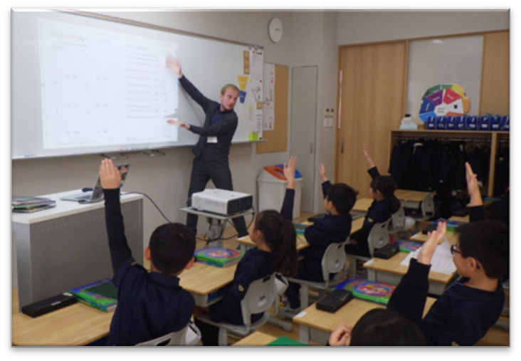 英語の授業は全学年毎日1時間設定されています。5,6年生はライティングに特化した授業も週に1時間英語の授業とは別に設定されています。また、英語の授業はもちろんのこと、算数、理科、フランス語、図工、ICTなどの授業を外国人教員が担当し1日の約半分の授業が外国語で進みます。副担任を外国人教員が務め、HRやランチブレイクは日本語と英語両方が使われる環境です。